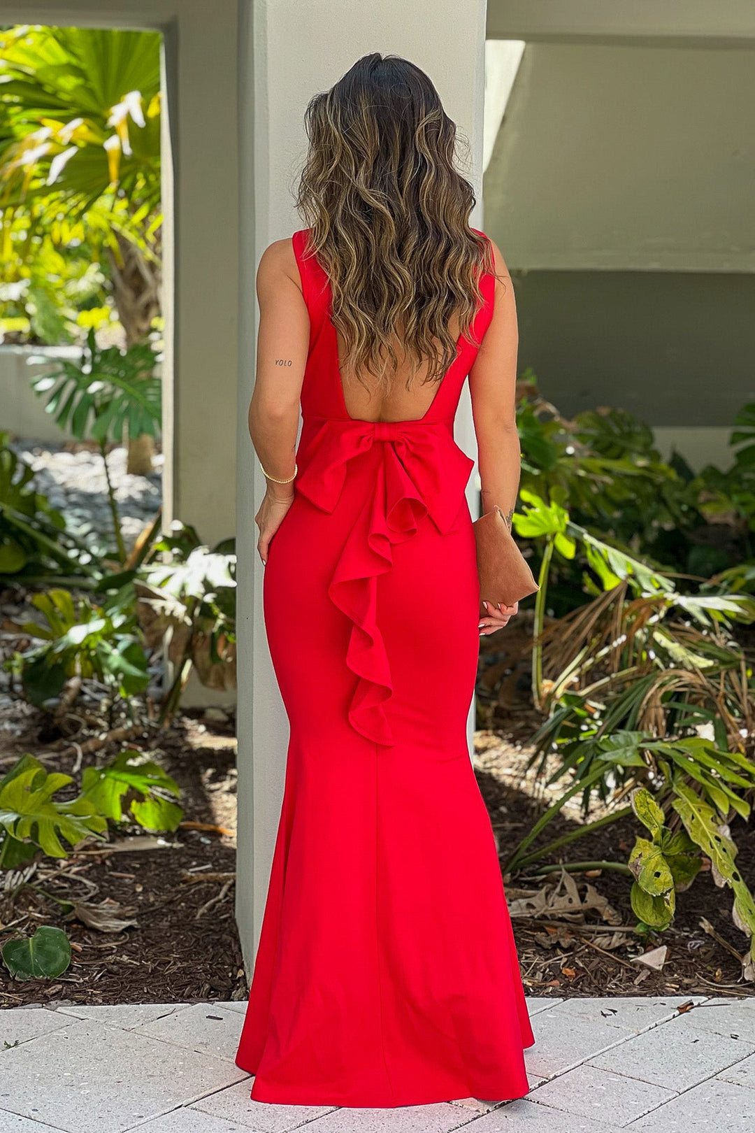 Red Maxi Dress With Open Back And Bow Detail