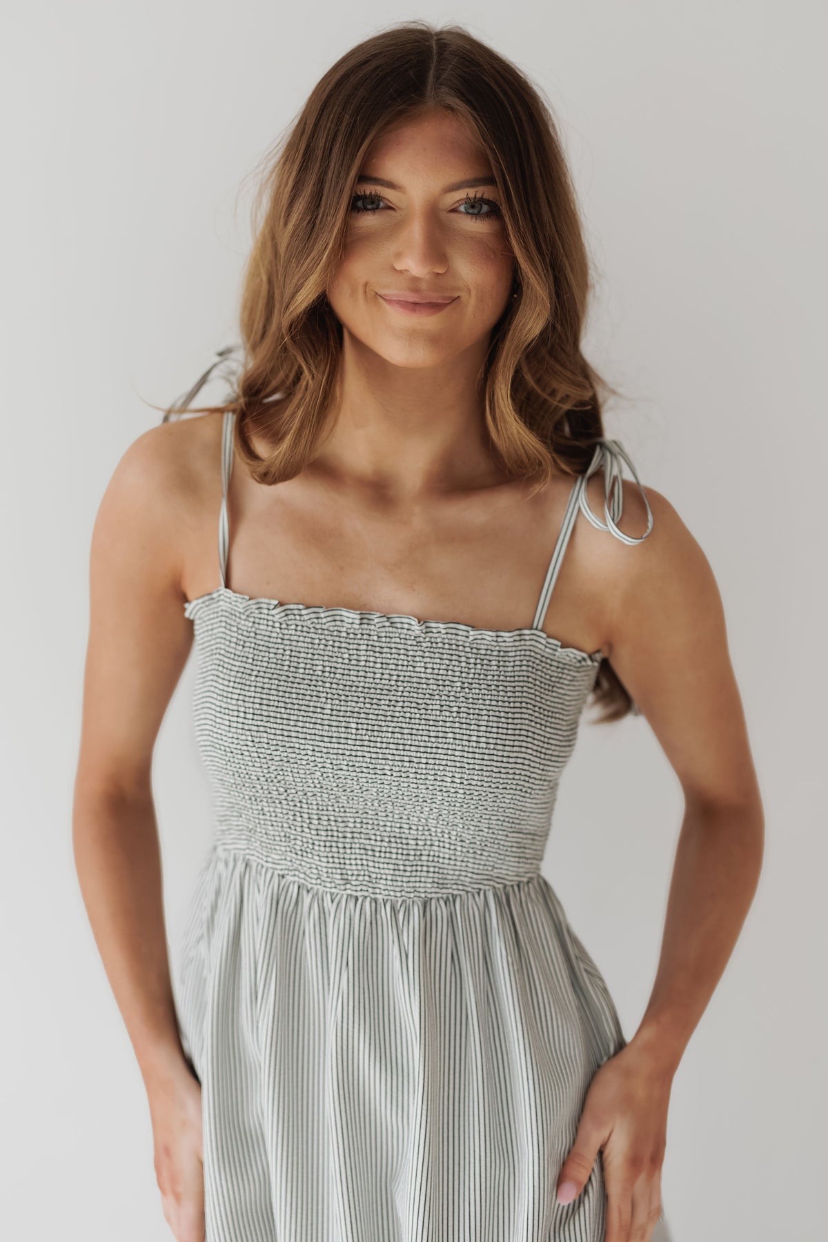 Fall in love with the "Abigail Dress!" This maxi dress is perfect for elevating your casual spring wardrobe! Boasting a fully smocked top with self tie straps that lead into a flowy maxi length skirt. The black and white stripes make for a perfectly versatile ensemble. Style with any sneakers or slides!