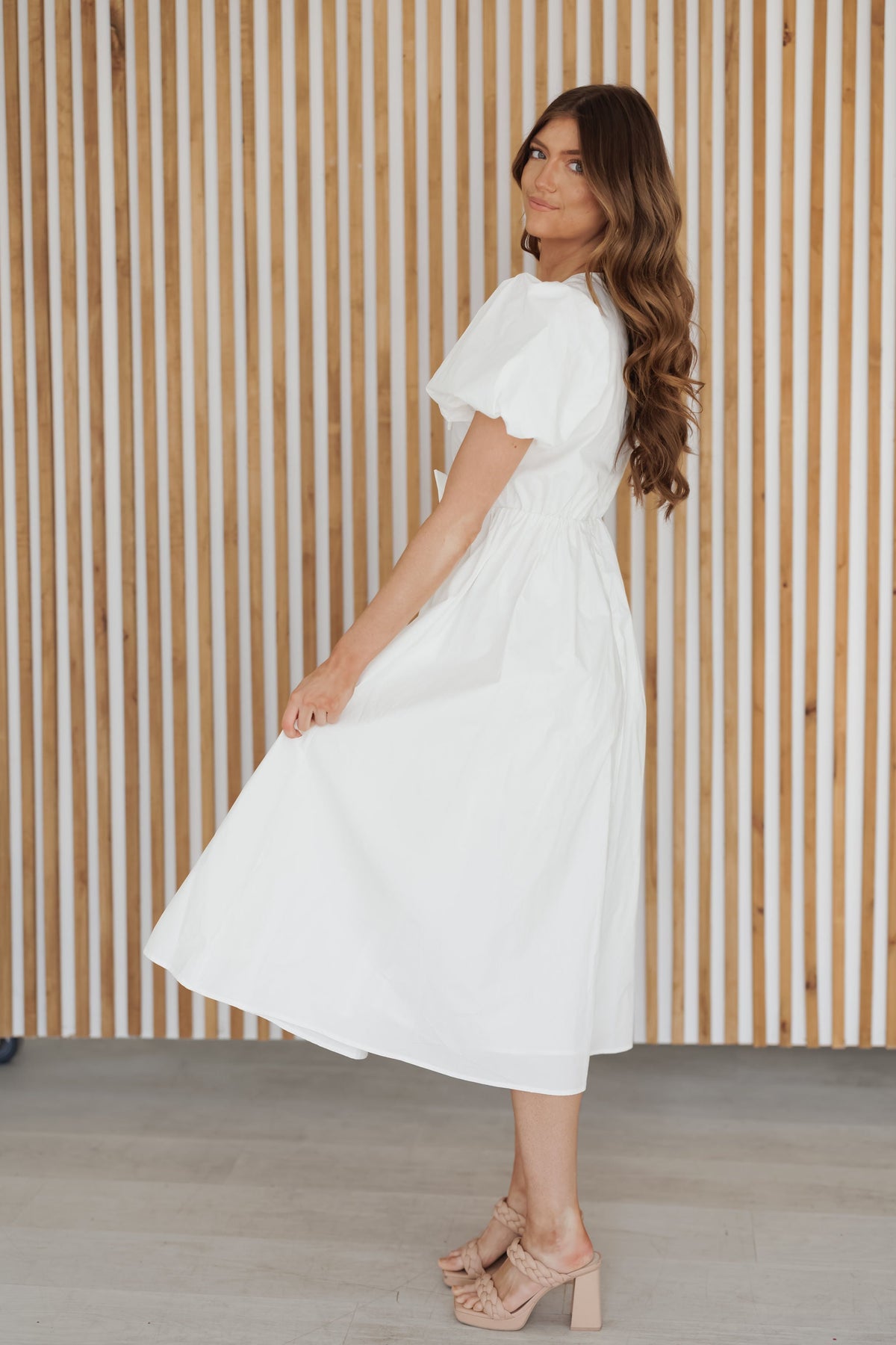 Be effortlessly feminine in the "Amelia Dress!" The perfect dress for any bride to be or for any spring event, this dress can do it all! It boasts a deep v-neckline with sewn on bows down the chest! The short puffed sleeves add a feminine and chic allure to the look. Style it up with heels or down with boots!
