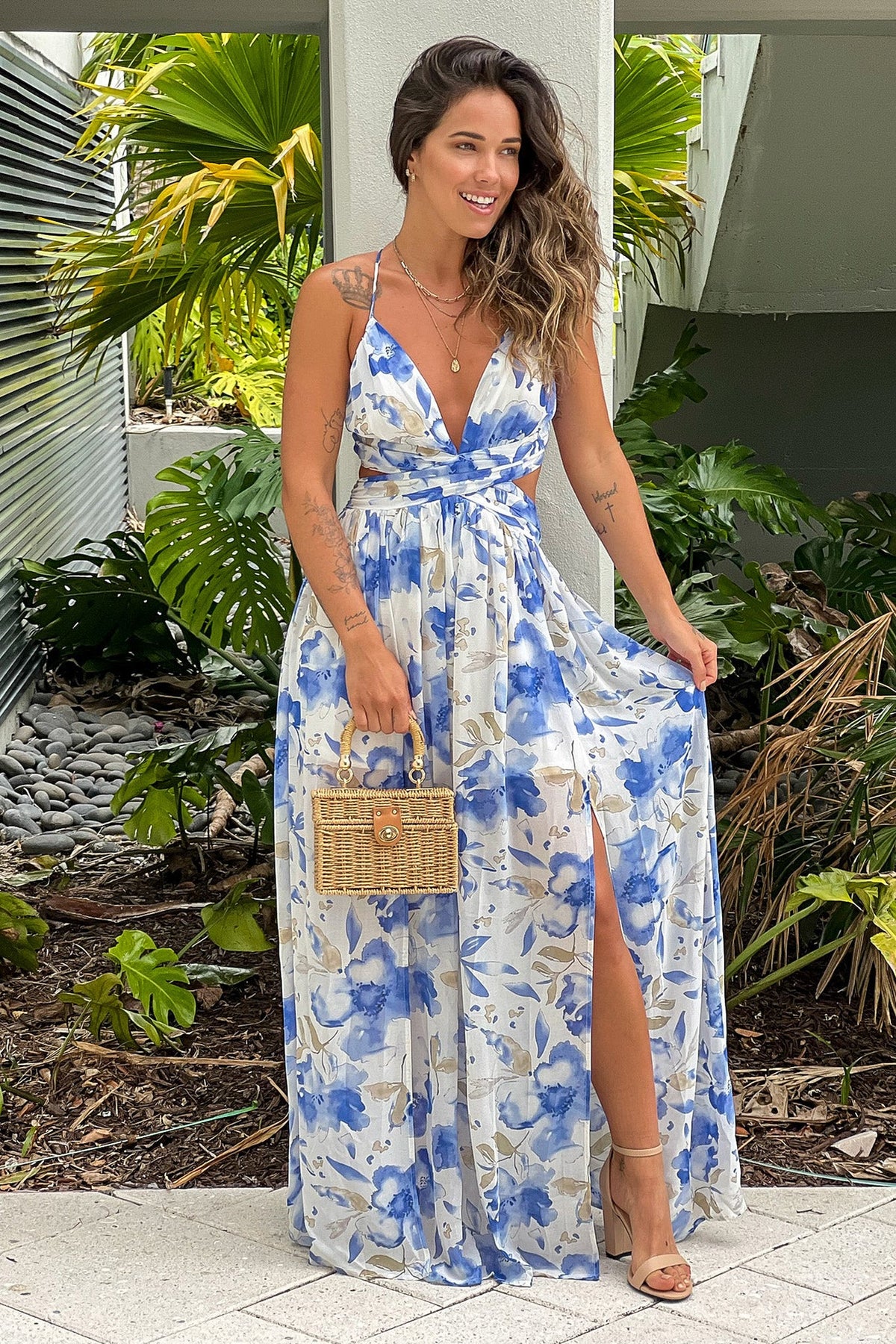 We are completely in love with this beautiful Blue Floral Maxi Dress With Cut Out And Slit! This adorable maxi dress features a amazing floral print and cool cut outs! Such a perfect casual dress for Summer!