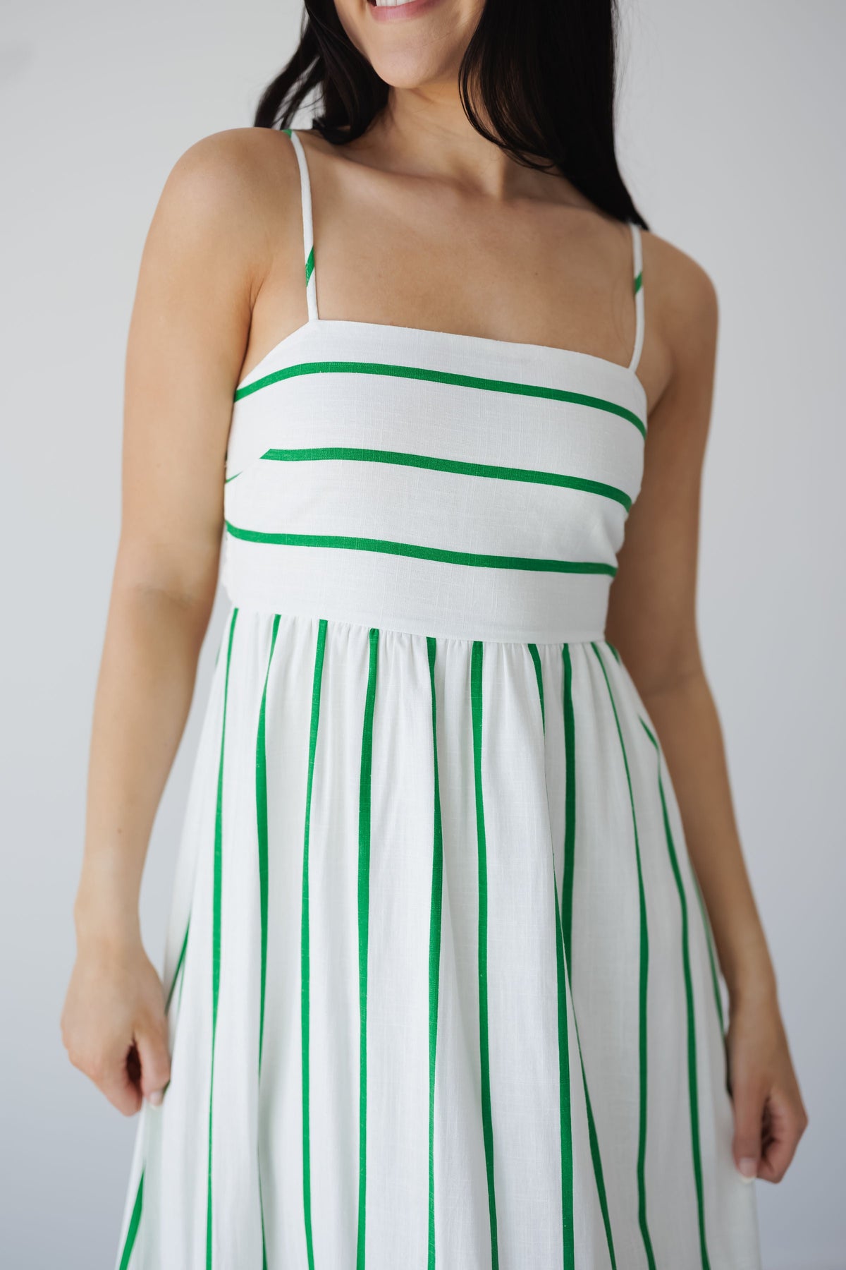 Introducing the “Christina Dress!” This timeless maxi dress is the perfect way to elevate your summer style! Boasting a white base with complimenting green stripes throughout, this dress is perfect for vacation or summer brunches. Complete with a straight neckline, adjustable straps, and a tiered bottom ruffle to complete the feminine look! Easily pairs with any sandals.