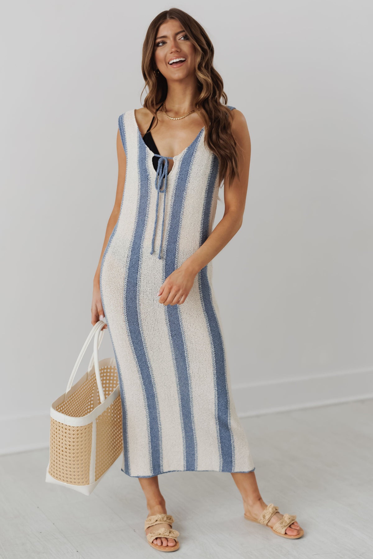 Introducing the new "Hannah Dress!" This knitted midi dress gives off all the vacation and spring break vibes! Its relaxed fit and coastal colors make this dress a must have piece when you start thinking about your vacation plans! It boasts a deep v-neckline, sleeveless sides, and blue and white stripes throughout!