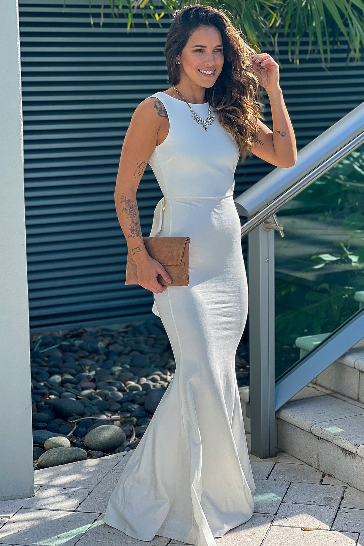 We are completely in love with this stunning Ivory Maxi Dress With Open Back And Bow that is now available at our online boutique! This amazing formal maxi dress features a beautiful bow detail and an elegant mermaid style. Perfect for any special occasion!