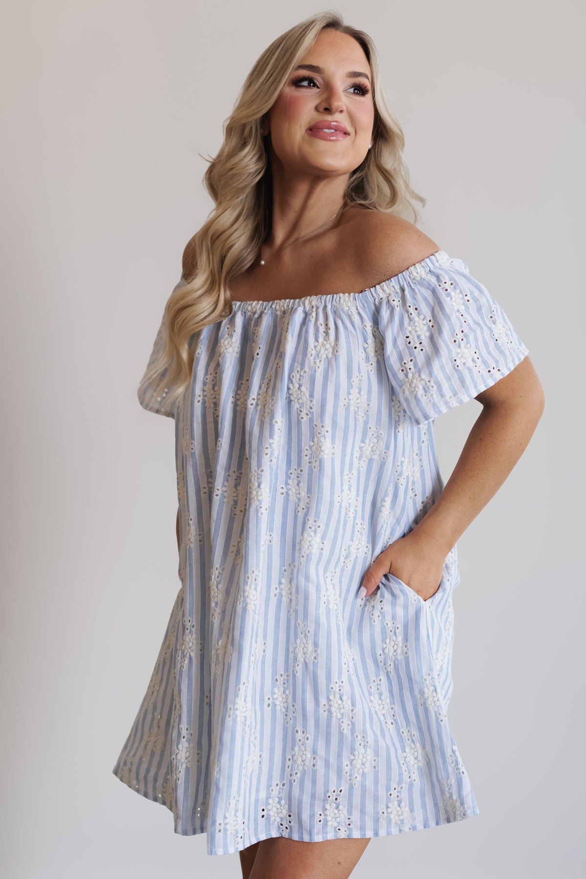 Feel your best in the “Jillian Mini Dress!” This feminine mini dress is such a great option for anyone looking for a casual, everyday look for the spring! Boasting blue and white stripes all throughout the dress, along with eyelet embroidery fabric to add the perfect spring touch! The off the shoulder neckline adds a touch of flirty and flattering flair!