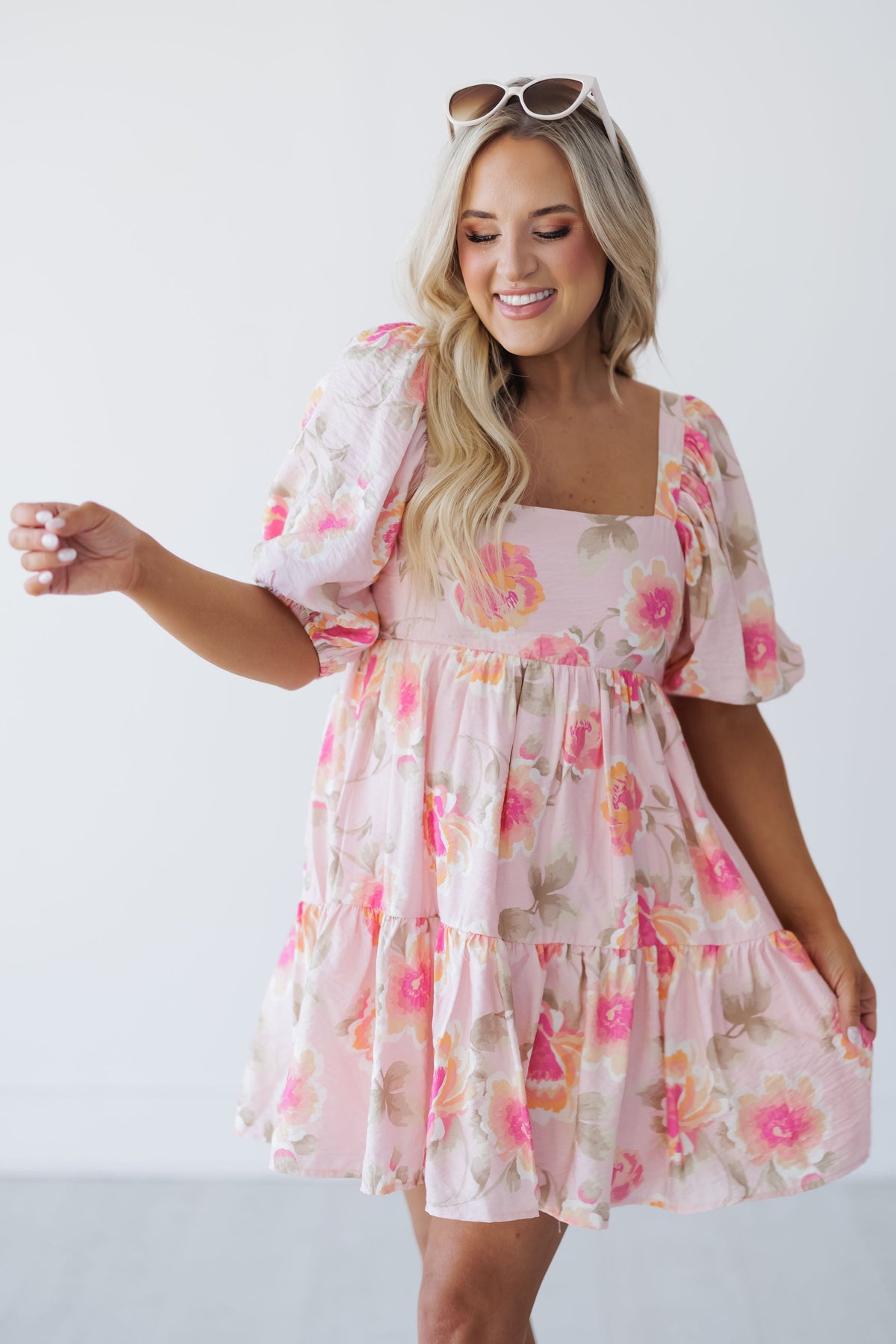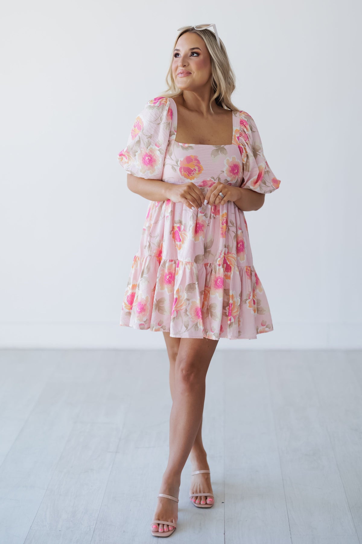 Be pretty in pink in the "Kelsey Dress!" We are loving the playful and seasonal vibes in this mini dress! Complete with a light pink base, multicolored florals throughout, and a stunning silhouette, this dress is truly adoring. An absolutely stunning option for a baby shower or date night!