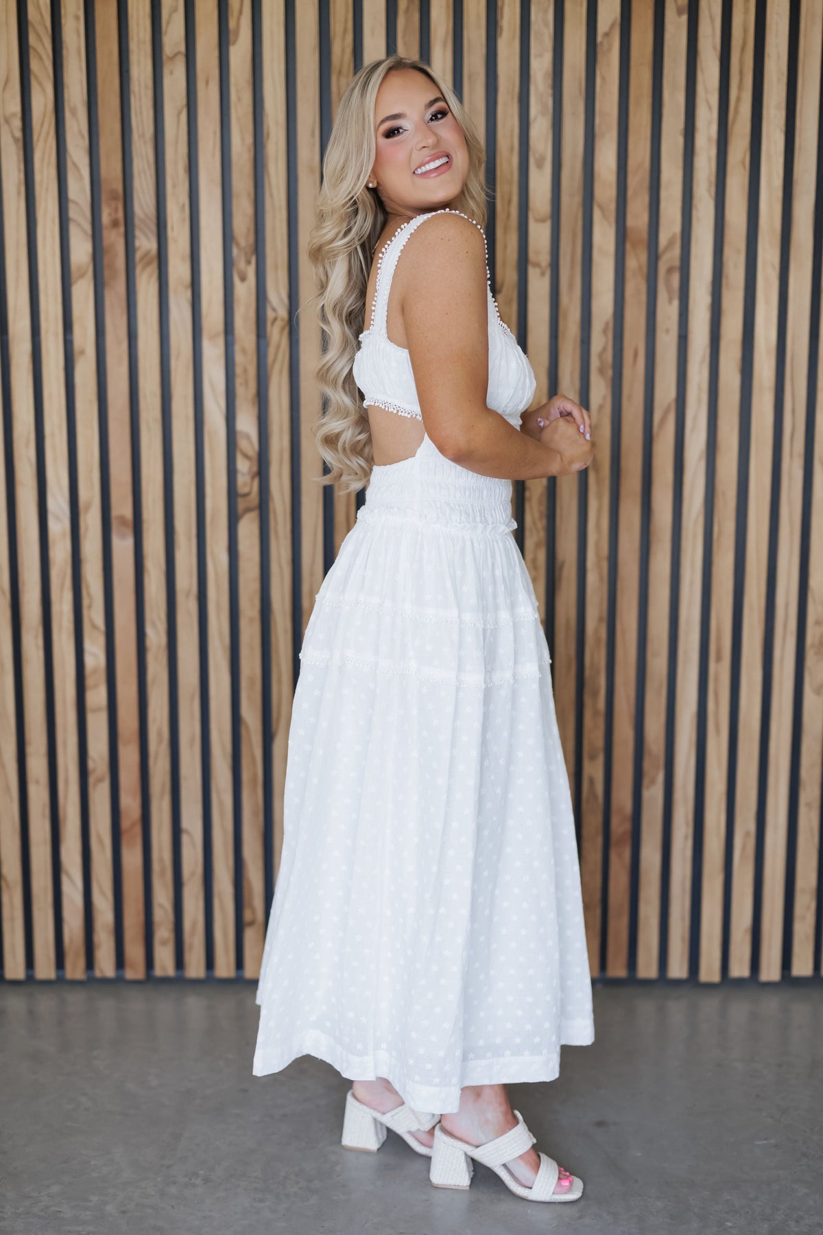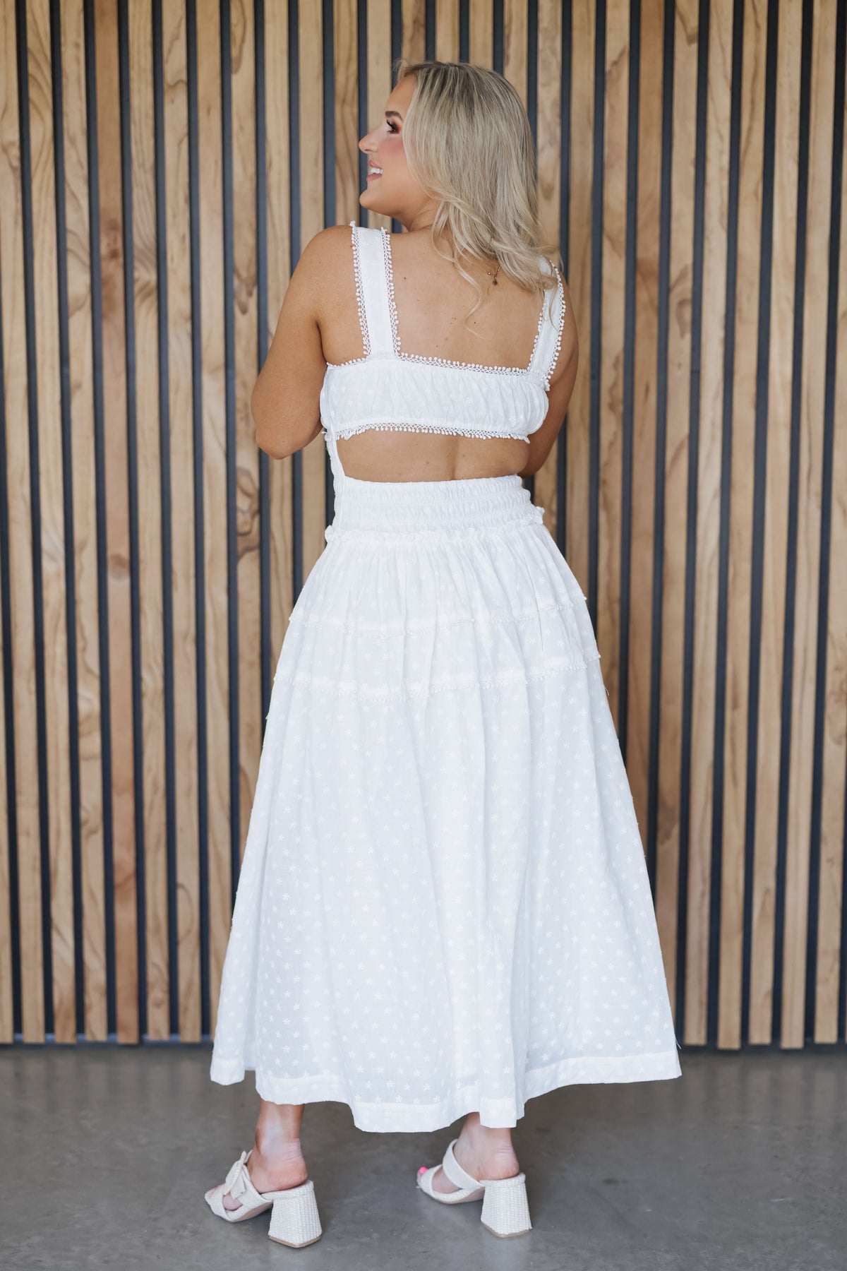 Introducing our stunning “Mallory Dress,” a perfect blend of elegance and charm! Crafted from lightweight, breathable fabric, this dress features delicate eyelet lace details that add a touch of femininity and sophistication. Thin straps provide a comfortable fit while accentuating your shoulders, and a smocked bodice ensures a flattering silhouette for all body types. Whether you're heading to a summer garden party, a romantic brunch, or a casual day out, this versatile midi dress can effortlessly transition from day to night!