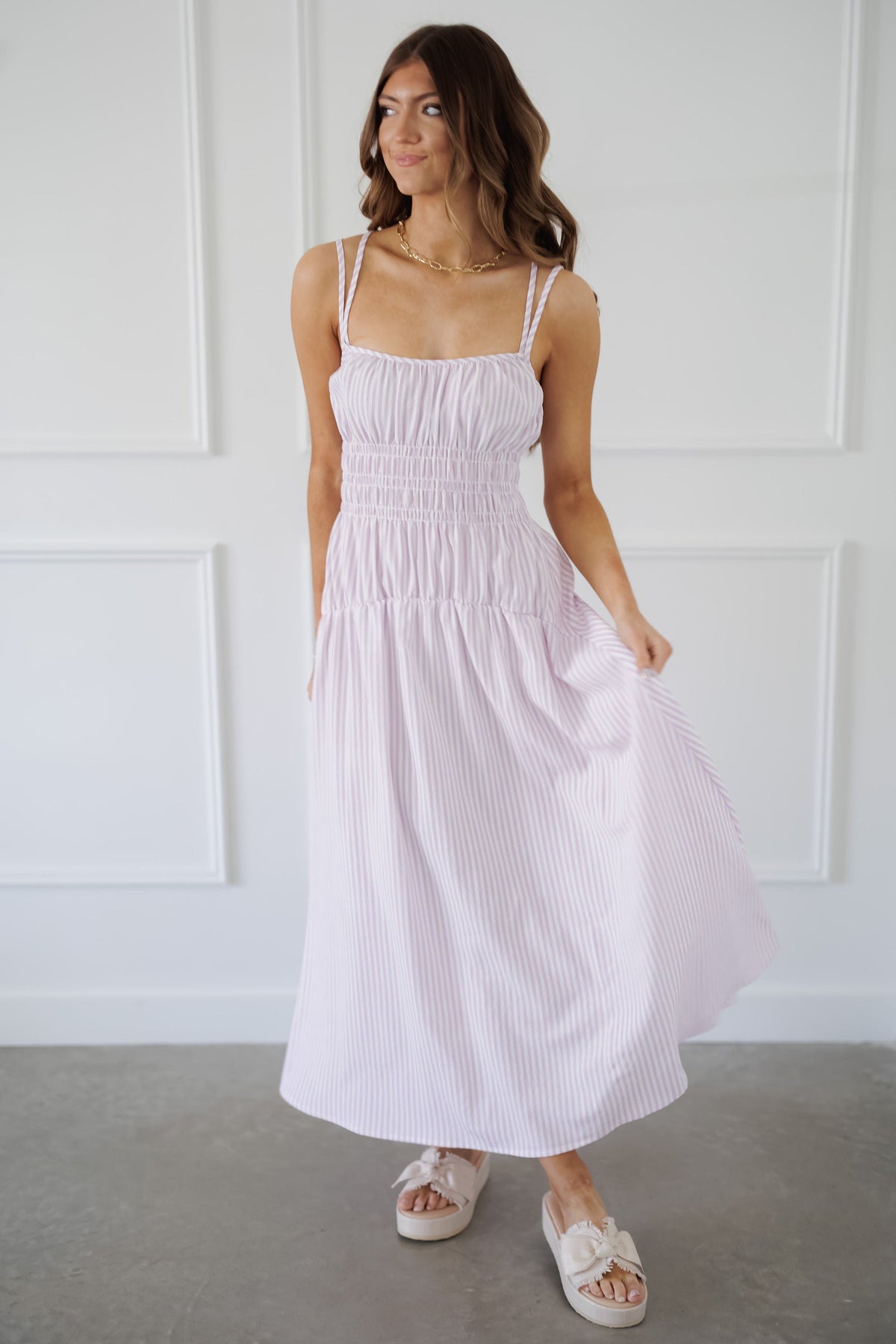 Twirl around in the “Miriam Dress!” We can’t get enough of the chic spring vibes in this dress! Featuring the most stunning lavender and white stripes, which perfectly embody the colors of spring, along with a flattering elastic bodice. The strappy back adds an elevated and flirty feel to this classic sundress!
