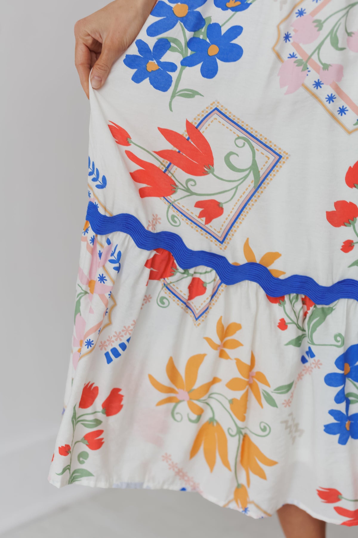 Turn heads in the "Phoenix Dress!" This tropical inspired dress is a total showstopper for your next vacation! Boasting a white base with a multi colored floral print throughout. The blue rick rack straps and trim detail add a bright pop of color that is perfect for the spring!