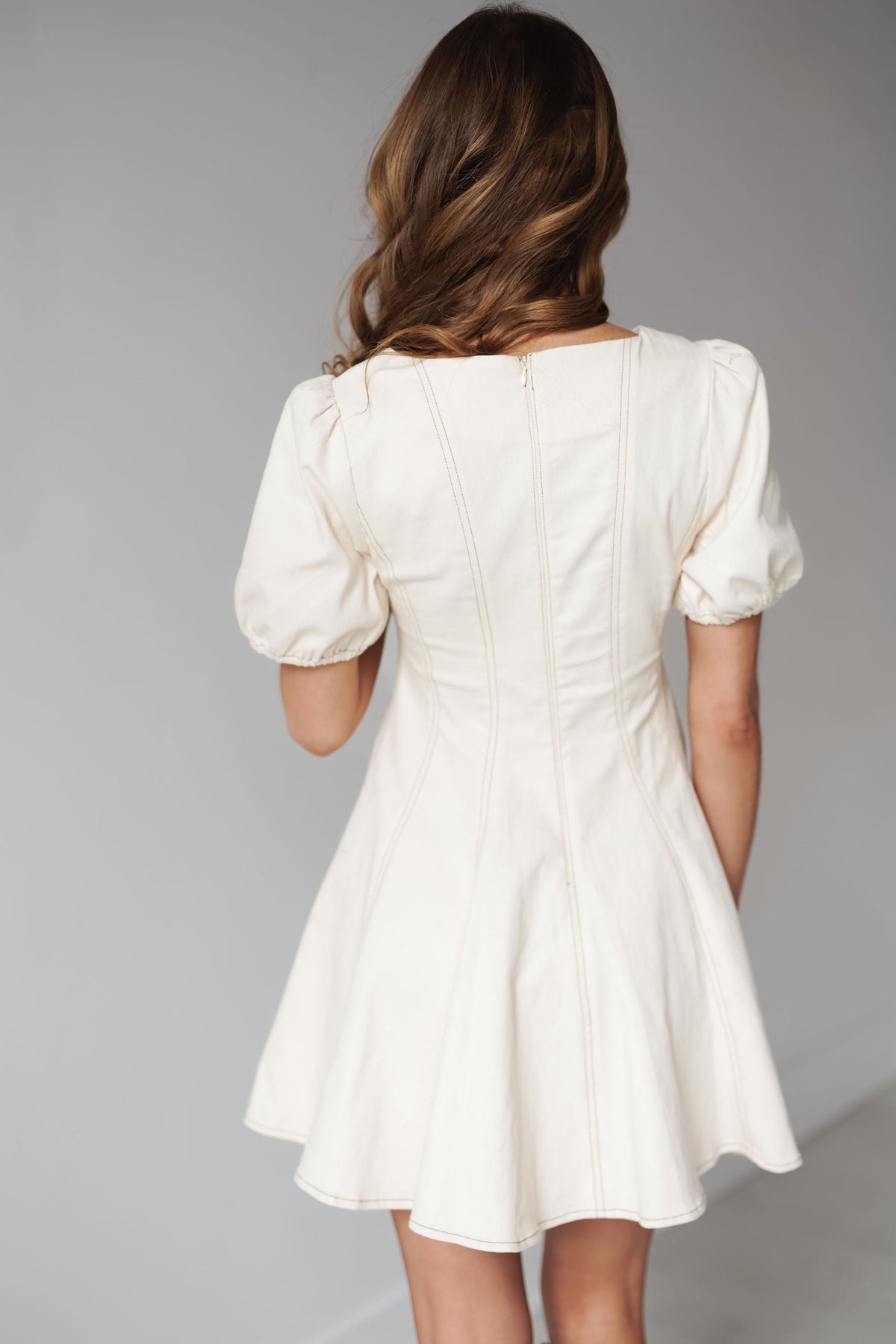 You are going to love this fit and flare dress, the "Rachel Mini Dress!" The perfect concert outfit, this cream dress will have you looking and feeling your best! It boasts a high neckline, short puffed sleeves, zip up back, and the perfect fit and flare silhouette! Style with any pair of cowgirl boots!