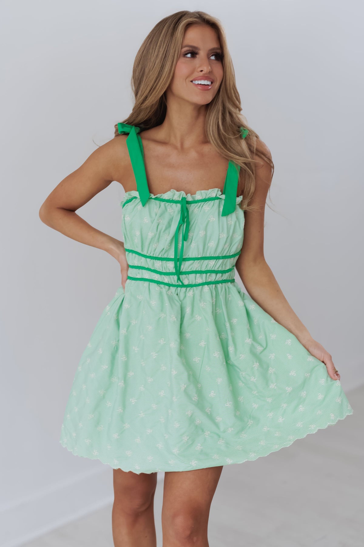 Introducing the new "Raelynn Mini Dress!" There are so many things to love about this green mini dress! Details including the embroidered bows throughout, self tie straps, and ruffled neckline make this dress a must have piece! Perfect for pairing with heels or boots!