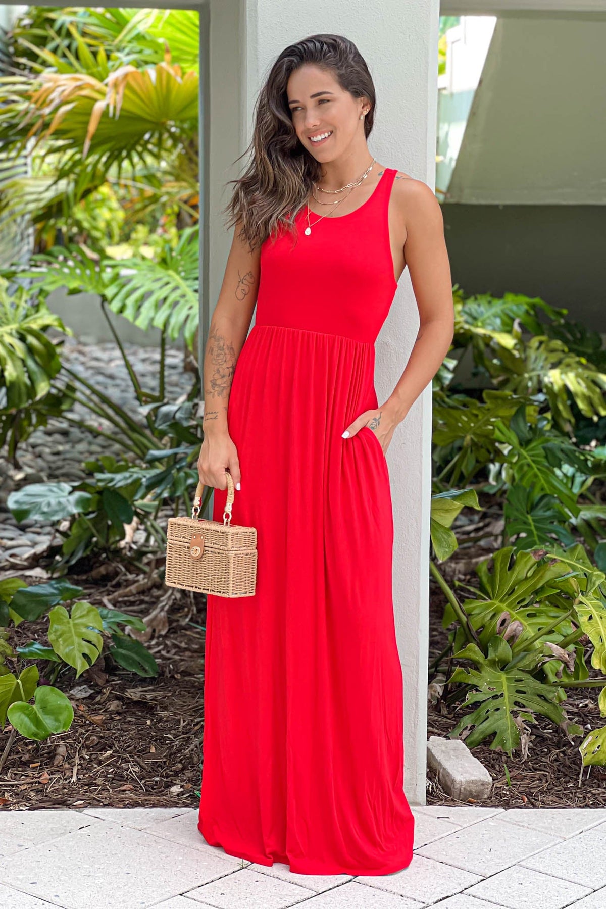 We are loving this comfy and cute Red Maxi Dress with Pockets that is now available at our online boutique! This pretty maxi dress is great for any casual event you are attending this summer!