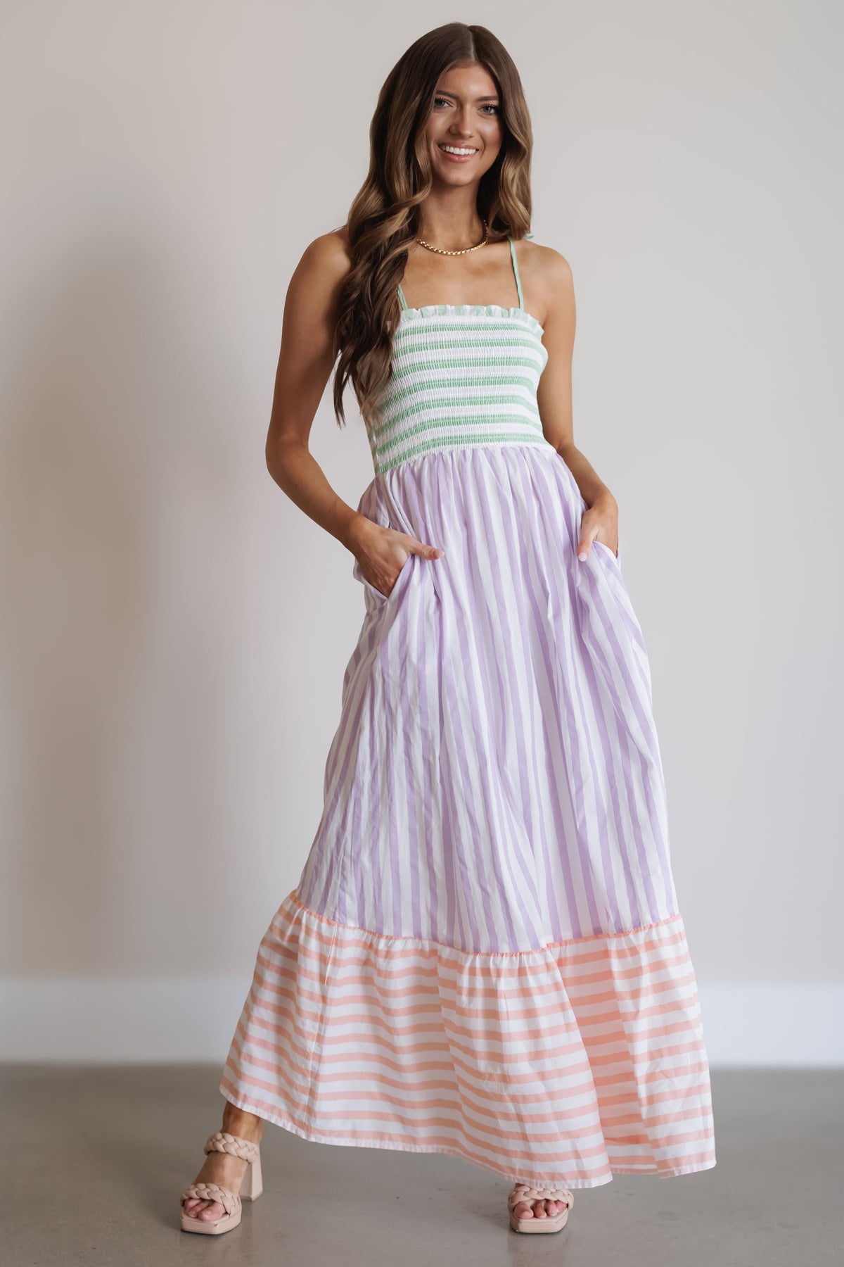 Enjoy the colors of spring in the "Sherbet Maxi Dress!" This dress is all things fun, bright, and warm! It features three segments, each with a different pattern and color. The top portion is a ruched, horizontal green stripe design, while the skirt has vertical lavender stripes. The bottom ruffle is an orange color with horizontal stripes. All together, this dress makes for the perfect beach vacation ensemble!