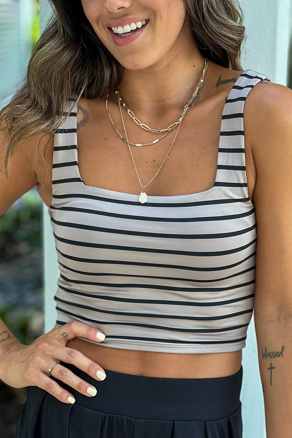 WOW, check out this adorable Taupe Striped Square Neck Crop Top! We are completely in love with its striped style and an elegant square neck! This pretty top is so easy to mix and match with any of your fave bottoms!