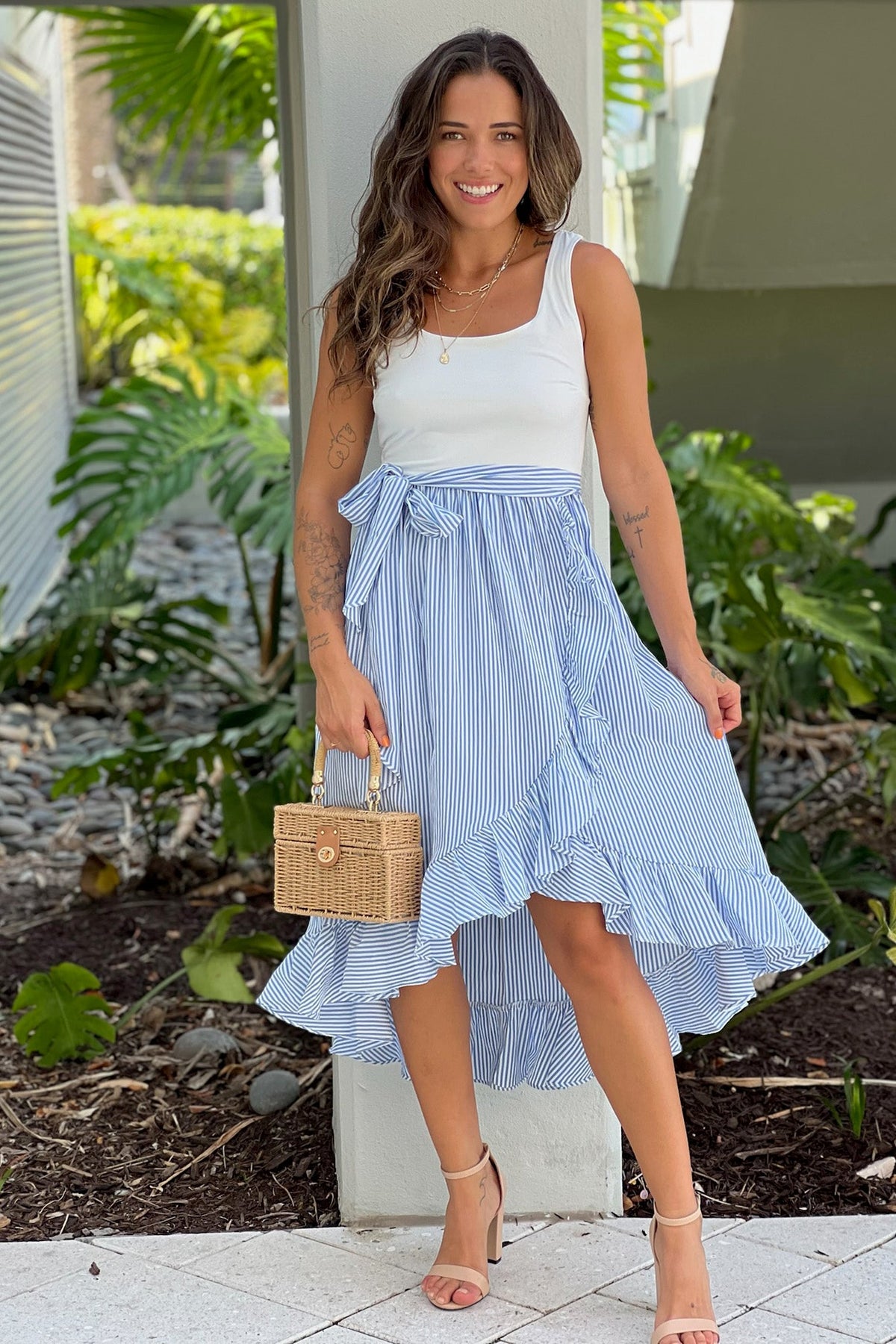 This White And Blue Striped Dress is so pretty! We love its beautiful ruffled striped skirt and classy looking white top! This amazing dress is perfect for your summer outings with family and friends!